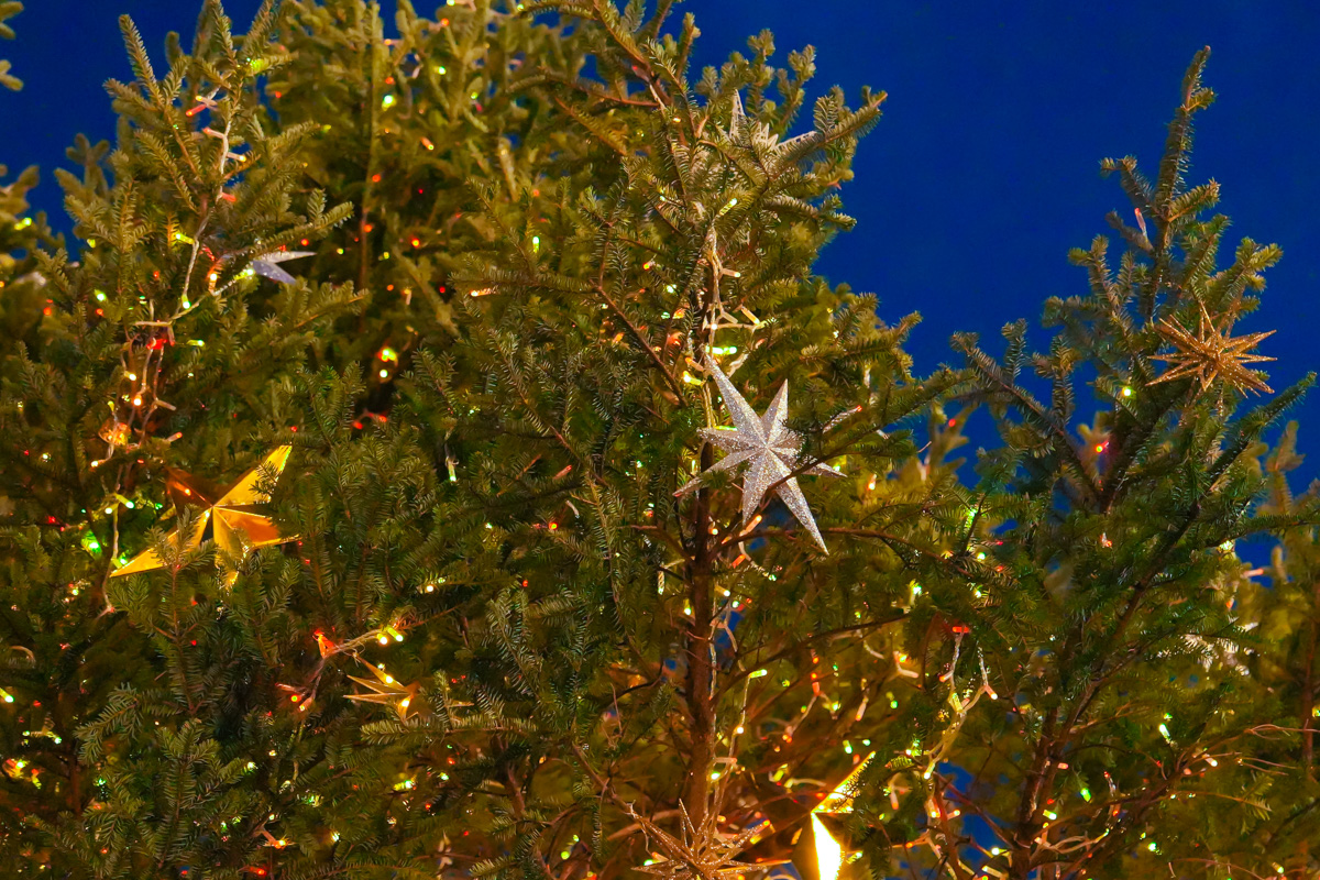 おぉー、横浜のベイサイドをバックに、イルミネーションが灯ったクリスマスツリーが映えます。