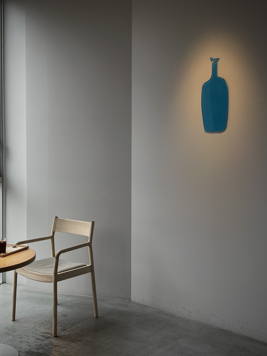 近くで見ると、ブルーボトルのマークもガラス製でした。味があって良いですね。